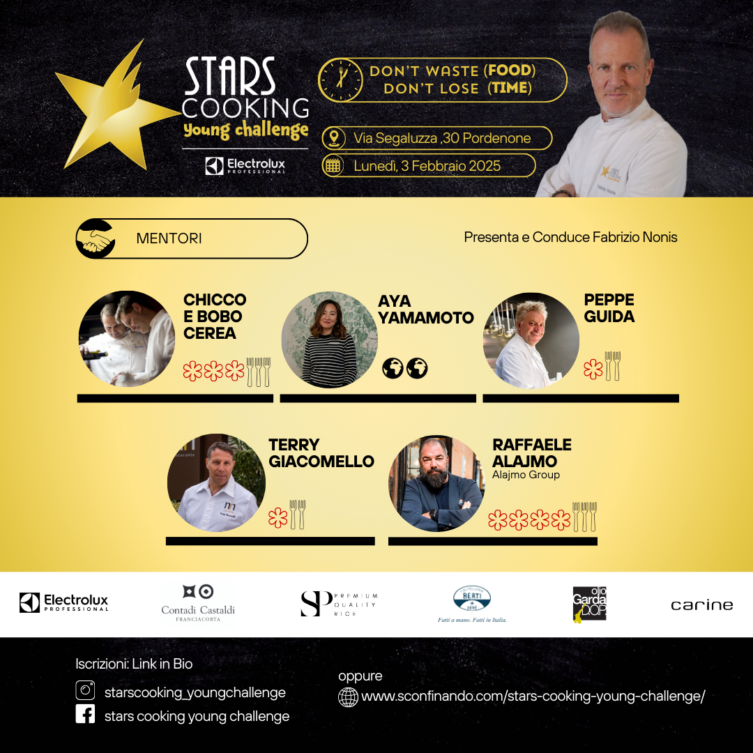 Saranno accompagnati da 5 Mentori d’eccezione a cui sarà consegnato il riconoscimento “Stars Cooking – Young Challenge Mentor” come: