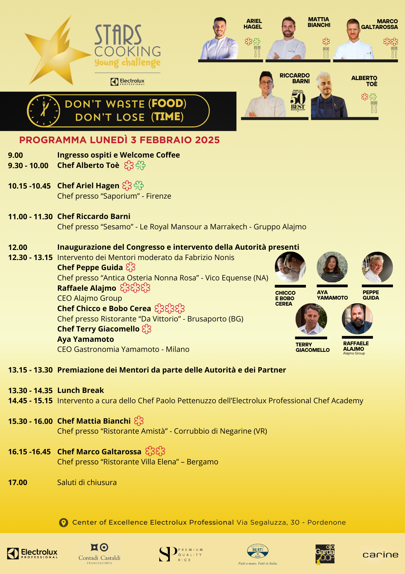 Una giornata speciale in cui saliranno in cattedra 5 giovani prestigiosi Chef e SousChef, nazionali ed internazionali, e 1 Chef del Center of Excellence di Electrolux Professional che proporranno le loro idee di cucina legati al tema cardine di quest’edizione: DON’T WASTE ( FOOD) DONT’LOSE ( TIME)